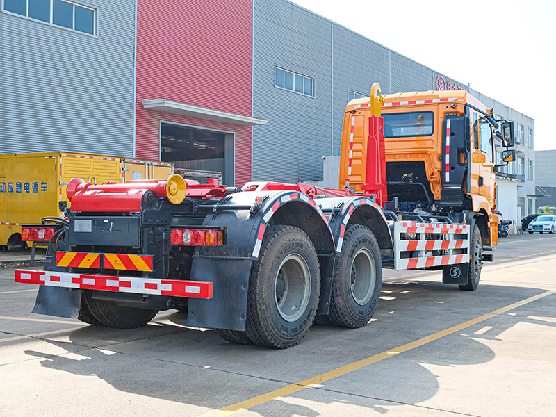 该车可将地下垃圾箱内的垃圾及垃圾箱一同拉车上运走同时可自卸,降低了工人的劳动强度。该垃圾车的收运方式是目前世界上广泛采用的垃圾收运方式,可以实现一车多箱,大大降低了配备成本和空间等等;其专用装置的功能均以汽车发动机为动力,通过液压机构手动或电控来实现。车辆的箱体采用优质炭钢板全密封焊接结构,具有强度高、重量轻、不产生二次污染等优点。