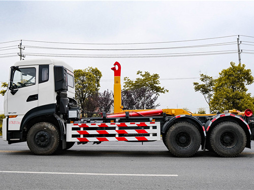该车可将地下垃圾箱内的垃圾及垃圾箱一同拉车上运走同时可自卸,降低了工人的劳动强度。该垃圾车的收运方式是目前世界上广泛采用的垃圾收运方式,可以实现一车多箱,大大降低了配备成本和空间等等;其专用装置的功能均以汽车发动机为动力,通过液压机构手动或电控来实现。车辆的箱体采用优质炭钢板全密封焊接结构,具有强度高、重量轻、不产生二次污染等优点。